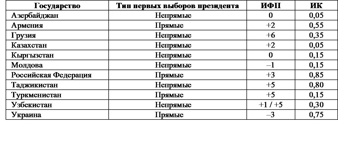 Среди республик с президенциализированной формой правления оказались: Армения (+2), Казахстан (+2), Россия (+3), Таджикистан (+5), Узбекистан (+5), Туркменистан (+5), Грузия (+6); парламентаризированной – Молдова (–1), Украина (-3); сбалансированной – Азербайджан (0), Кыргызстан (0).