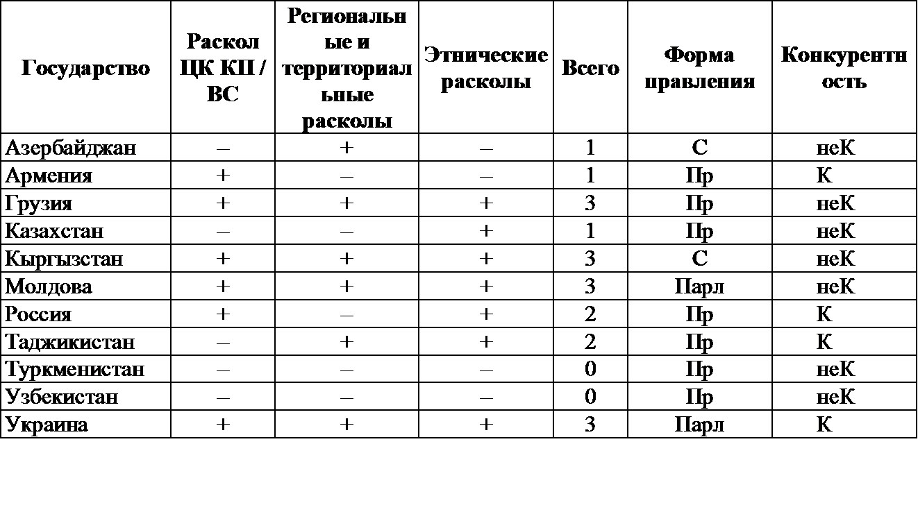 1) с наличием всех трех видов расколов: Украина, Молдова, Грузия, Кыргызстан;