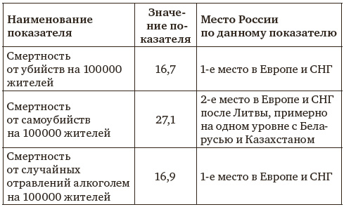 Несмотря на докризисные экономические успехи, внутриполитическую стабилизацию и другие позитивные тенденции последних лет, общее состояние современного российского общества выглядит очень тревожным. Так, количество убийств на 100 тысяч жителей в нашей стране сейчас почти в 4 раза больше, чем в США (где ситуация в данном отношении тоже очень неблагополучна), и примерно в 10 раз превышает их распространенность в большинстве европейских стран. По количеству самоубийств не только среди населения в целом, но и среди молодежи в возрасте до 17 лет наша страна в 3 раза опережает США, занимая второе место в Европе и СНГ (по числу самоубийств среди молодежи – после Казахстана)[1]1