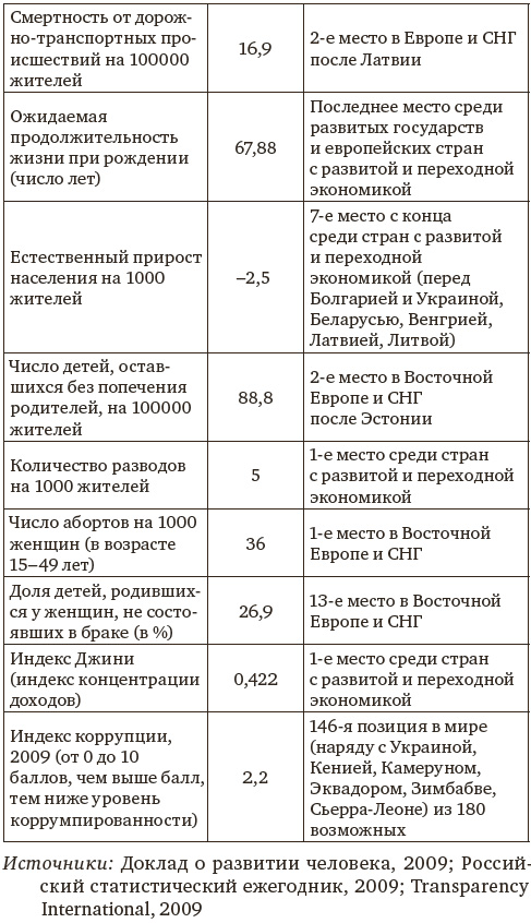 [Закрыть]. По индексу коррупции за шесть лет (с 2002 по 2008 гг.) наша стана перебралась с 71-го на 147-е место в мире, а общий объем коррупционного оборота в России оценивается экспертами в 250–300 млрд долларов в год. Численность жертв несчастных случаев, таких как случайные отравления алкоголем и ДТП, по числу которых мы занимаем 1-е место в мире, свидетельствуют о безразличном отношении многих наших сограждан к своей и к чужой жизни[2]2