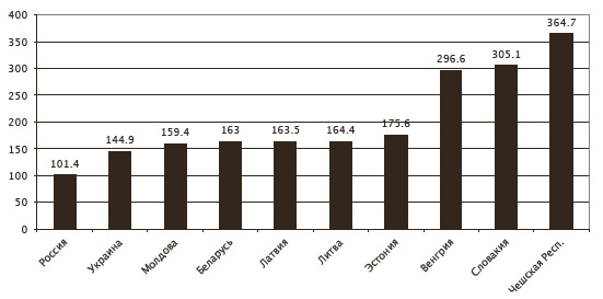 Рис. 2. Индекс нравственного состояния общества в России и странах Центрально-Восточной Европы (уровень России за 1996 г.=100 %), 2008 г.