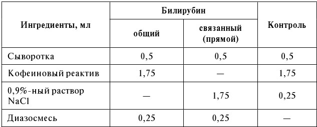 Колориметрическим методом по Мейленграхту можно ориентировочно определить концентрацию билирубина. При взаимодействии сульфаниловой кислоты с нитритом натрия образуется диазофенилсульфоновая кислота (диазосмесь), которая дает со связанным (прямым) билирубином сыворотки розово-фиолетовое окрашивание. По его интенсивности судят о концентрации связанного билирубина, дающего прямую реакцию. При добавлении к сыворотке крови кофеинового реактива несвязанный (непрямой) билирубин переходит в растворимое диссоциированное состояние и также дает розово-фиолетовое окрашивание с диазосмесью одновременно с прямым билирубином. По интенсивности окраски, образующейся после добавления кофеинового реактива, определяют концентрацию общего билирубина. По разнице между общим и связанным (прямым) билирубином находят содержание несвязанного (непрямого) билирубина. В 3 пробирки (для общего билирубина, прямого и для контроля) вводят реактивы в порядке, указанном в таблице 31.