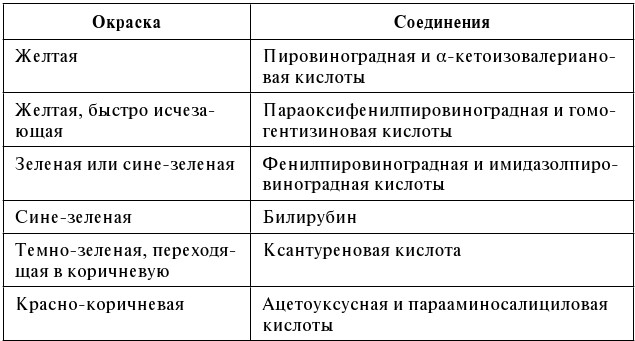 Сине-серую окраску дает повышенное содержание фенилаланина, коричневую – триптофан, пурпурную – смесь различных аминокислот, а появление синей окраски в виде ободка свидетельствует о присутствии в моче свободного пролина (не менее 0,1 мг/мл). Можно сравнивать интенсивность окраски с цветной шкалой. Для приготовления стандартных растворов, содержащих от 0,1 до 0,5 мг/мл соответствующих аминокислот, используют растворы аминокислот с исходной концентрацией 0,5 мг соответствующей аминокислоты в 1 мл раствора.