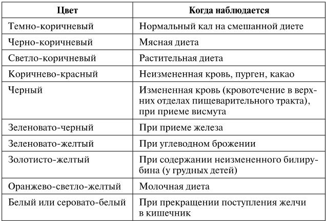 Цвет. У здоровых людей (взрослых) пигментом каловых масс является стеркобилен, который придает им коричневатую окраску. Однако цвет фекальных масс обусловлен не только пигментами, но и целым рядом факторов, важнейшим из которых является характер питания. На окраску испражнений влияют лекарства и патологические примеси. Изменение окраски экскрементов в зависимости от различных условий представлено в таблице 38.