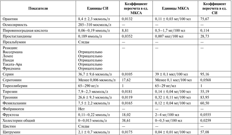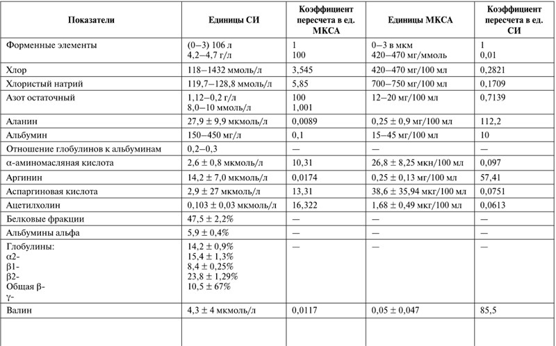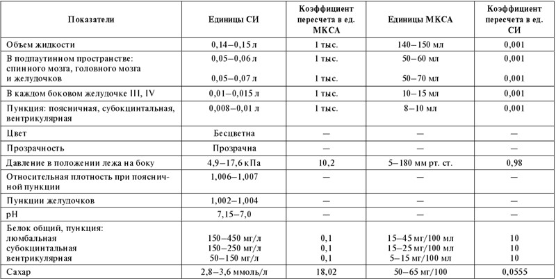 Применение международной системы единиц СИ вызывает определенные затруднения в оценке результатов исследования спинномозговой жидкости. В таблице 48 приведены показатели нормы в единицах СИ в сравнении с традиционными, для чего приводятся соответствующие коэффициенты перевода показателей в традиционную систему, которая встречается в старых изданиях.