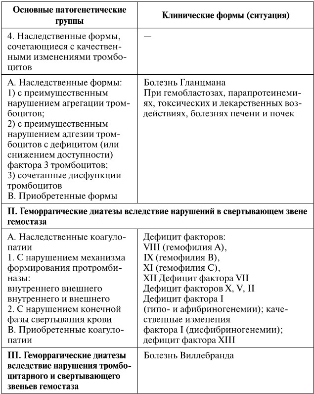 Различают наследственные (семейные) формы с многолетней, начинающейся с детского возраста кровоточивостью и приобретенные формы, в большинстве своем вторичные (симптоматические). Большая часть наследственных форм связана с аномалиями мегакариоцитов и тромбоцитов, дисфункцией последних либо с дефицитом или дефектом плазменных факторов свертывания крови, а также фактора Виллебранда, реже с неполноценностью мелких кровеносных сосудов (телеангиэктазия, болезнь Ослера – Рандю). Большинство приобретенных форм кровоточивости связаны с ДВС-синдромом, иммунными и иммунокомплексными поражениями сосудистой стенки (васкулит Шенлейна – Геноха, эритемы и др.) и тромбоцитов (большинство тромбоцитопений), с нарушениями нормального гемопозза (геморрагии при лейкозах, гипо– и апластических состояниях кроветворения, лучевой болезни), токсико-инфекционным поражением кровеносных сосудов (геморрагические лихорадки, сыпной тиф и др.), заболеваниями печени и обтурационной желтухой (ведущими к нарушению синтеза в гепатоцитах факторов свертывания крови), воздействием лекарственных препаратов, нарушающих гемостаз (антиагрегантов, антикоагулянтов, фибринолитиков) либо провоцирующих иммунные нарушения – тромбоцитопению (гаптеновая форма), васкулиты.
