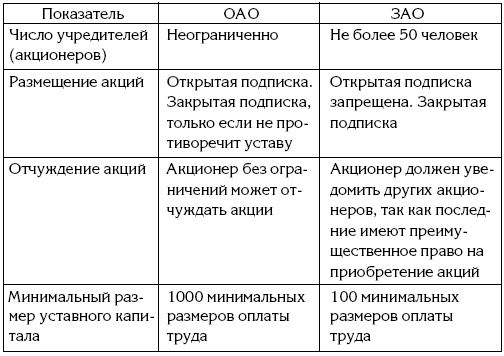 Законом установлено, что общества могут быть открытыми (ОАО) или закрытыми (ЗАО), и это должно отражаться в уставе и фирменном наименовании. Открытые и закрытые акционерные общества имеют различия, указанные в табл. 1.