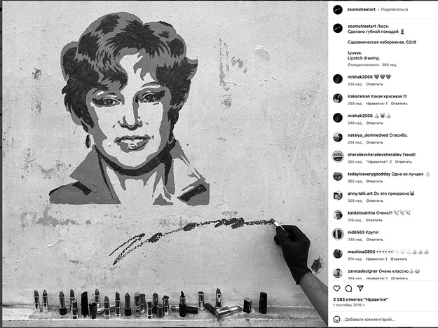 [Закрыть]. И все же иногда изображения начинают жить своей жизнью, проступая через плотные слои скрывающей их краски. Так произошло и с портретом Людмилы Гурченко. Нарисованный помадой, добавившей ему особую интимность и нежность, через несколько дней он отчетливо проступил через баффинг, что несказанно обрадовало всех следящих за его судьбой. Это событие, немедленно попавшее в ленты городских новостей, – отражение желания горожан выстраивать коммуникацию на своих условиях, иметь собственных, а не навязанных им гигантскими муралами героев, надежда на то, что в зарегулированном городе есть место случайности и чему-то «живому, со смыслом, не за деньги, искреннему» – именно так Zoom высказался о спонтанных, несанкционированных уличных изображениях в интервью, которое мы взяли у него в июле 2018 г.