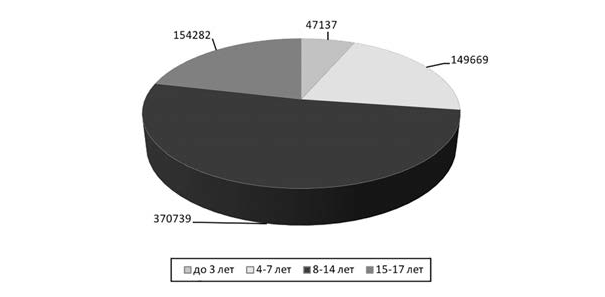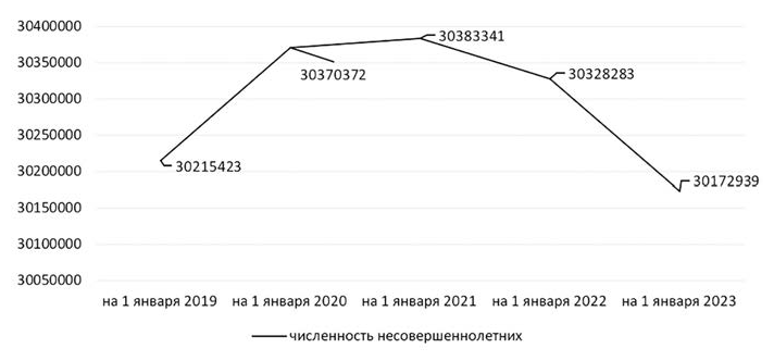Так, по состоянию на 1 января 2023 г. в России проживало 30 172 939 детей, что составляет 20 % от всего населения страны (на 1 января 2019 г. – 30 215 423, на 1 января 2020 г. – 30 370 372, на 1 января 2021 г. – 30 383 341, на 1 января 2022 г. – 30 328 283)[111]111