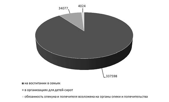 Одной из наиболее уязвимых социальных групп являются дети-сироты и дети, оставшиеся без попечения родителей, их общая численность в 2022 г. составила 375 699 человек, в том числе: 337 598 – на воспитании в семьях, 34 077 – под надзором в организациях для детей-сирот и детей, оставшихся без попечения родителей, в отношении 4024 человек исполнение обязанностей опекуна или попечителя возложено на органы опеки и попечительства (диаграмма 1.4.2)