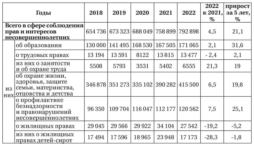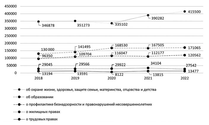 Сразу оговоримся, что вопросы качества и эффективного правовых норм нашли свое отражение в § 1.2 монографии «Правовые основы отношений в сфере защиты прав несовершеннолетних», в связи с чем данный параграф будет посвящен вопросам изучения наиболее значимых общественно-политических, социально-экономических факторов, которые существенным образом повлияли на состояние законности в сфере охраны прав несовершеннолетних, изменения структуры и уровня правонарушаемости в сфере защиты прав несовершеннолетних за последние пять лет (2018–2022), оценки состояния работы органов и организаций, осуществляющих полномочия в сфере защиты прав несовершеннолетних, в том числе в охраны жизни и здоровья, образования, социальной защиты, профилактики безнадзорности и правонарушений несовершеннолетних, состояния защищенности детей, находящихся в сложном социальном положении, в том числе детей участников специальной военной операции, детей-сирот и детей, оставшихся без попечения родителей, детей-инвалидов и других категорий детей, нуждающиеся в особой государственной поддержке.
