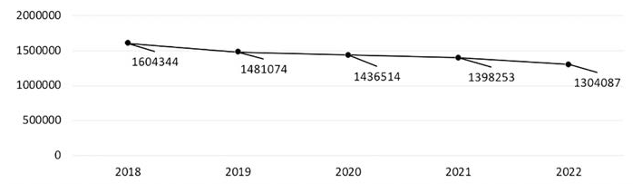 В 2022 г. родилось 1 304 087 детей, что на 6,73 % меньше, чем в 2021 г. (в 2018 г. – 1 604 344, в 2019 г. – 1 481 074, в 2020 г. – 1 436 514, в 2021 г. – 1 398 253)[128]128