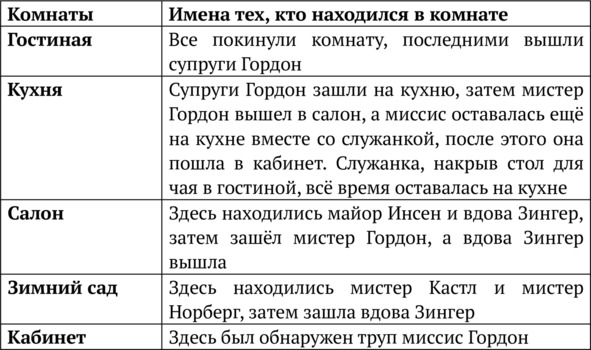 – Хорошо, господа, если никто не против, я готов попробовать найти преступника. Для начала давайте установим, кто и где находился после окончания первой игры, когда все разошлись по разным комнатам. Насколько я знаю, в доме пять комнат: гостиная, где проходила игра, кабинет, салон, зимний сад и кухня. Я хочу выяснить, кто и где находился в момент убийства. Начинаем с вас, мистер Гордон.
