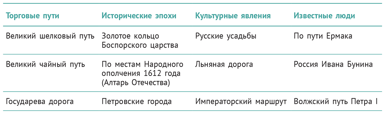 Таблица 1. Примеры культурно-познавательных маршрутов в России