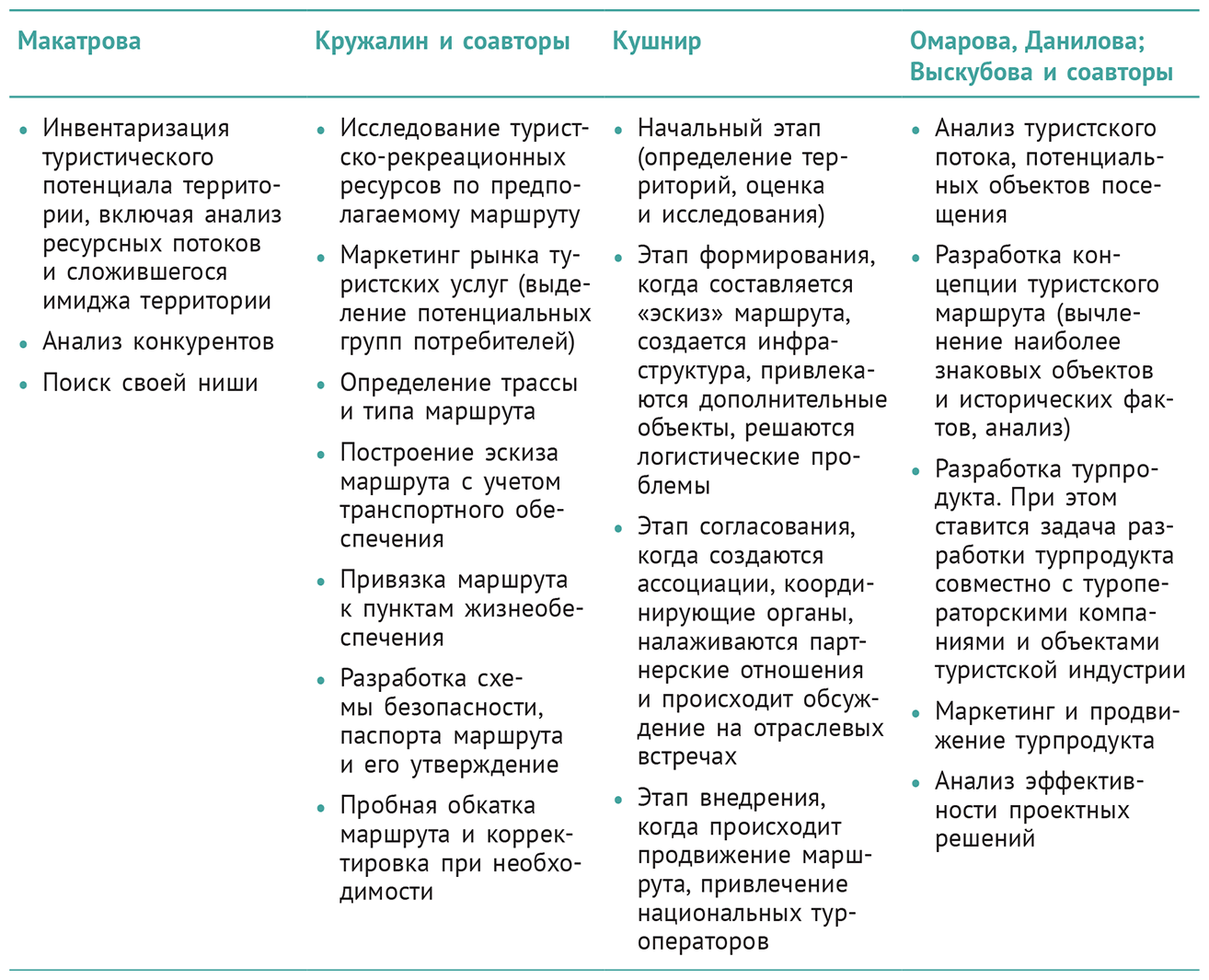 Анализируя наиболее значимые отечественные работы, посвященные развитию туризма на территории и проектированию турмаршрутов, можно выделить несколько подходов к процедурам и алгоритмам (табл. 2).