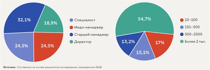 В рамках опроса также запрашивалась информация о позиции респондента в организации. Предварительно позиции были разделены на четыре условные группы: директор, старший менеджер, мидл-менеджер и специалист. Результаты опроса показали, что наибольшее количество респондентов – это старшие менеджеры (32,1 %), а наименьшее (18,9 %) – директора компаний. На специалистов и мидл-менеджеров пришлась практически равная доля респондентов (порядка четверти респондентов на каждую роль).