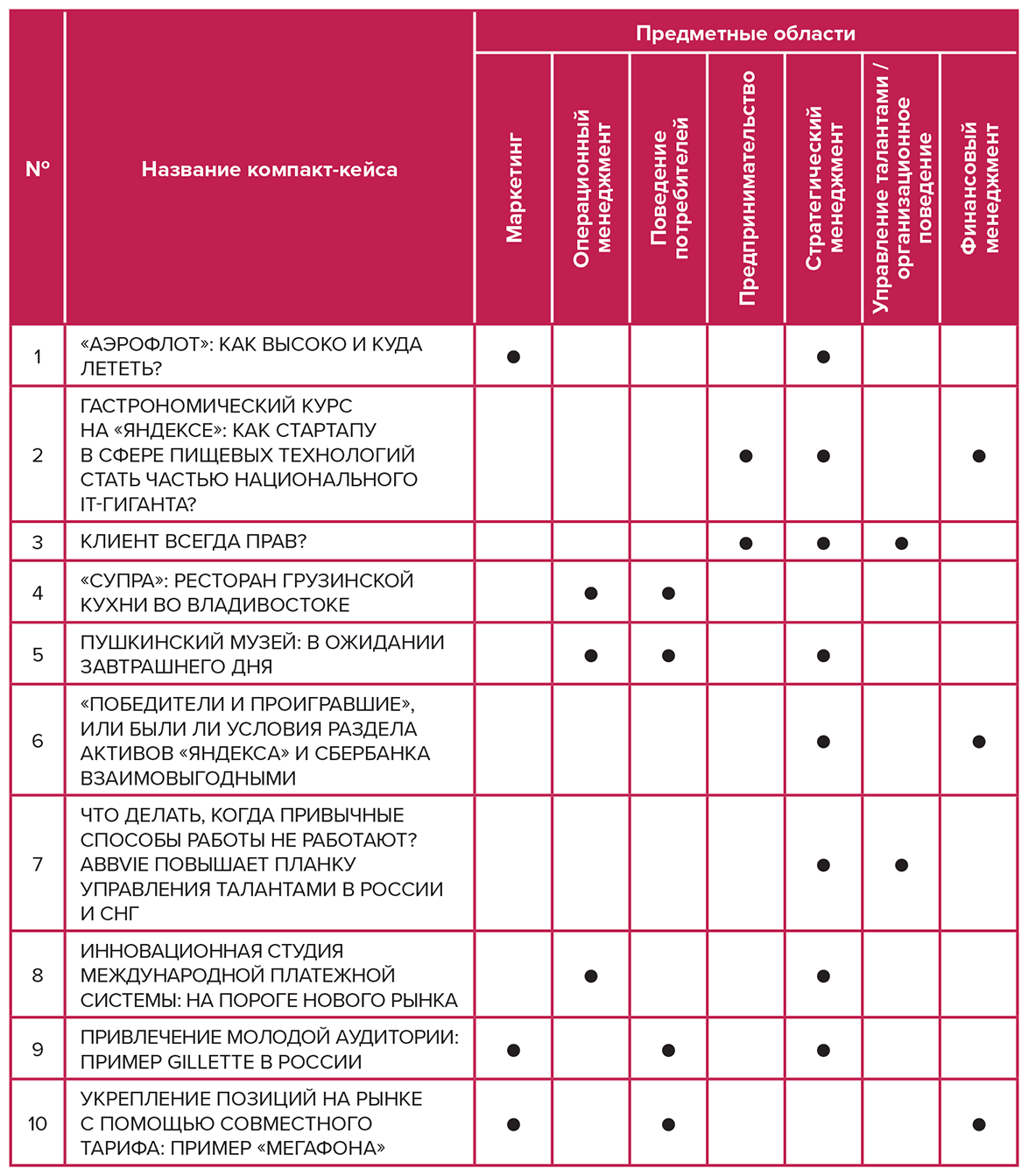 Так, выбору стратегических альтернатив в условиях турбулентной бизнес-среды посвящены три кейса. Кейс «Аэрофлот: как высоко и куда лететь?» сфокусирован на вопросах стратегического менеджмента в связке с маркетингом, когда перед одним из самых известных брендов России стоит задача разработки новой стратегии в условиях непостоянной, изменчивой среды. Кейс «Клиент всегда прав?» подчеркивает сложность существования личного бренда рекрутера при работе по подбору персонала для сторонней компании. Кейс «“Победители и проигравшие”, или были ли условия раздела активов “Яндекса” и Сбербанка взаимовыгодными» позволяет детально погрузиться в специфику стратегических сделок, рассматривая различные методы оценки стоимости компаний.