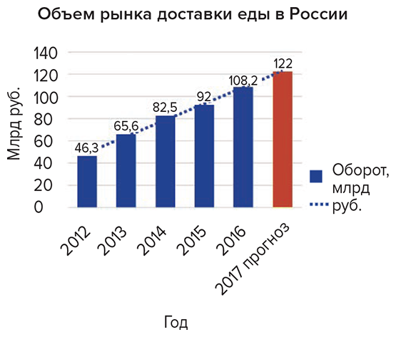 Источник: Составлено авторами по данным компании «ГидМаркет» (Возобновление роста рынка доставки еды // РБК. 2017. 27 декабря. https://marketing.rbc.ru/articles/10112/)