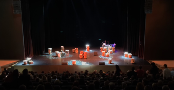 В полумраке стопки, на которых что-то лежит, подсвечиваются плавным мерцанием, когда по мере продвижения спектакля предметы используются, оно прекращается.