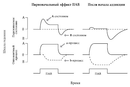 На Рисунке 1.4 представлена модель оппонентного процесса формирования аддикции, адаптированная Т. Робинсоном и К. Берриджем на основании работ Solomon 1977 и Solomon, Corbit 1973 (Robinson, Berridge, 2003a). На левой половине рисунка показаны два процесса: a-процесс – это аффективная гедонистическая реакция на стимул (на рисунке – ПАВ), который, в свою очередь, с целью сохранения гомеостаза и приглушения положительного аффекта вызывает противоположный b-процесс (негативный аффект). Оба процесса складываются вместе, вызывая первоначальное приятное состояние А (эйфория), за которым следует противоположное неприятное состояние B. Видно, что величина и продолжительность изначально приятного состояния A больше относительно следующего за ним состояния В. Однако при повторном употреблении наркотиков и в случае развития зависимости (правая сторона рисунка) оппонентный b-процесс увеличивается по величине и продолжительности, что приводит к переживанию B-состояния, в котором доминируют неприятные симптомы, связанные с воздержанием от употребления, например, синдромом отмены.