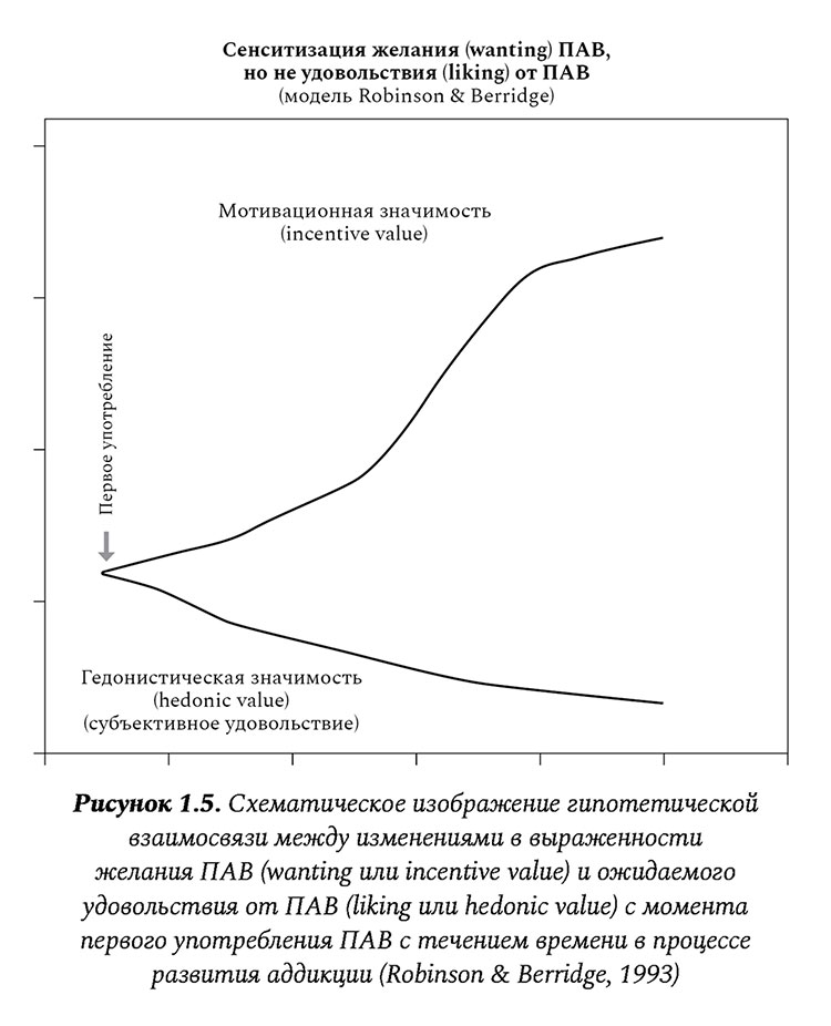 Теория стимульной сенситизации (повышение ответа/гиперреактивность на стимул) к награде объясняет формирование аддикции следующим образом: многократное самостоятельное употребление ПАВ приводит к нейроадаптации, при которой поведение в ответ на повторяющиеся стимулы все меньше контролируется ожидаемым удовольствием («liking») и все больше побудительной значимостью стимула («incentive salience»), субъективным проявлением которой является желание («wanting») (см. Рисунок 1.5) Согласно данной теории, ценность более важна, чем польза.