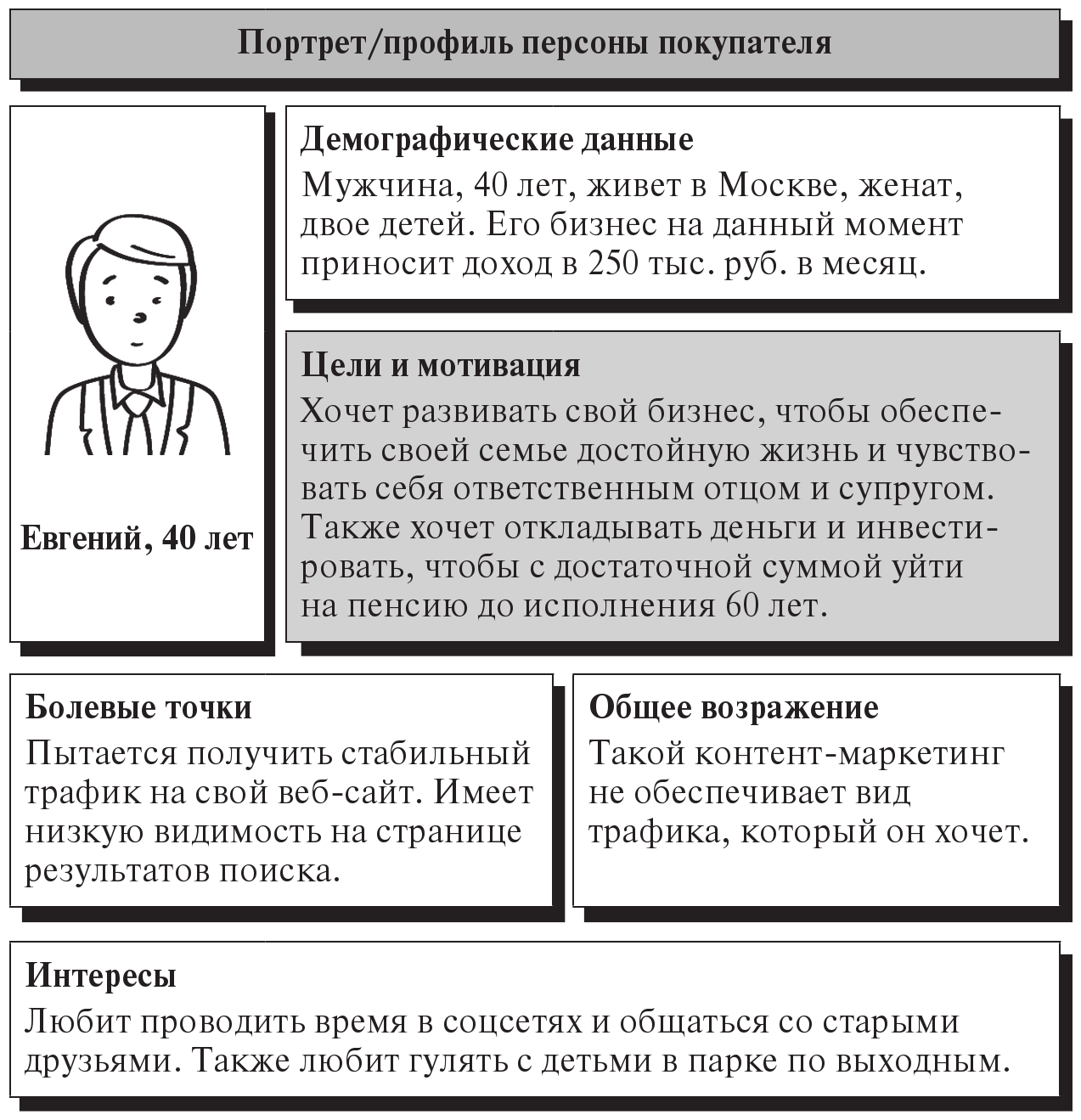 При создании портрета персоны необходимо указать ее имя, возраст, демографические данные, цели и мотивацию, болевые точки, желания и интересы. На рис. 4.4 представлен пример анализа «Портрет/профиль персоны покупателя».