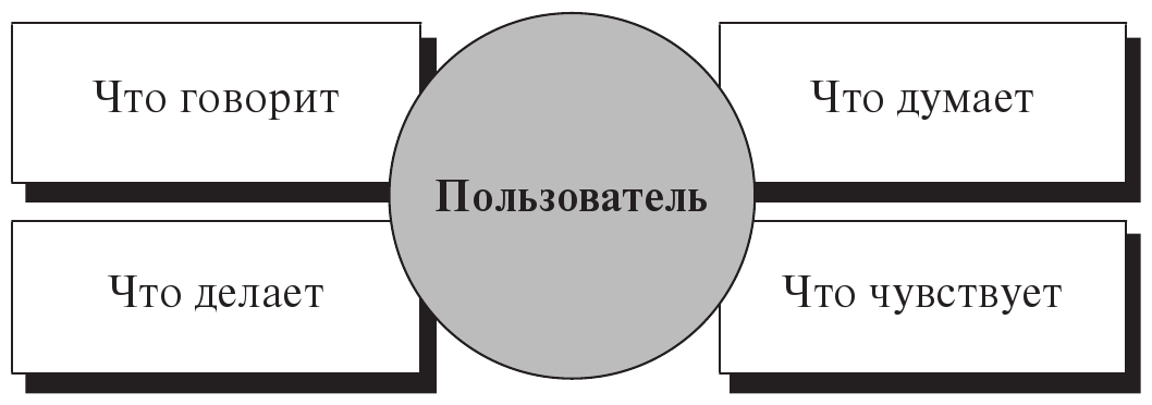 Шаблон карты эмпатии представляет собой четыре квадранта, с помощью которых можно структурировать информацию о пользователях. В каждый квадрант записывается информация о том, что пользователь: говорит, думает, делает, чувствует (рис. 4.5).