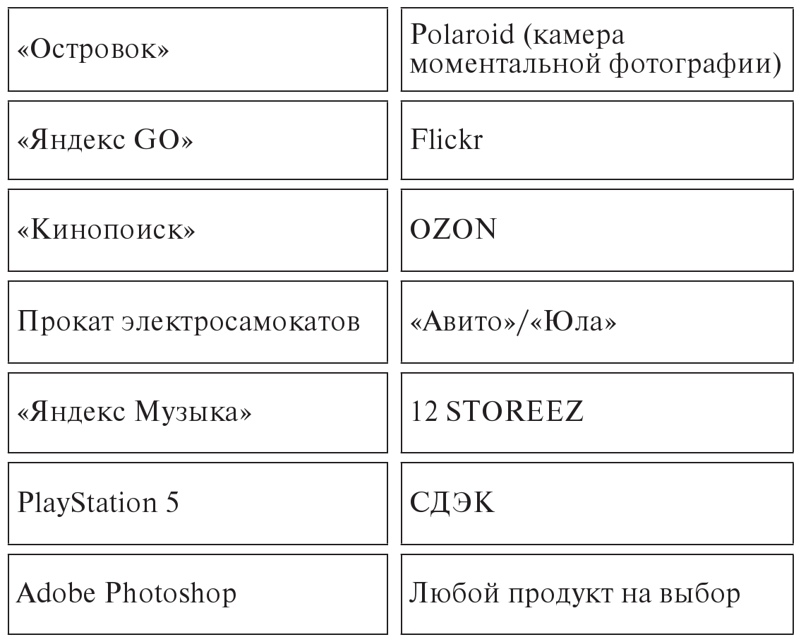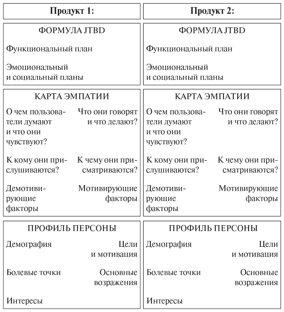Теперь изучите планы (функциональный, эмоциональный, социальный) «работы» продуктов, проанализировав их аудиторию. Выберите два пункта из перечисленных ниже и подберите по два примера соответствующих продуктов. Используйте формулу JTBD вместе с картой эмпатии и шаблоны профиля персоны. Например, к «канцелярии» можно подобрать такие продукты, как блокнот из киоска и записная книжка фирмы Moleskine. При необходимости вы можете опираться на табл. 4.1.