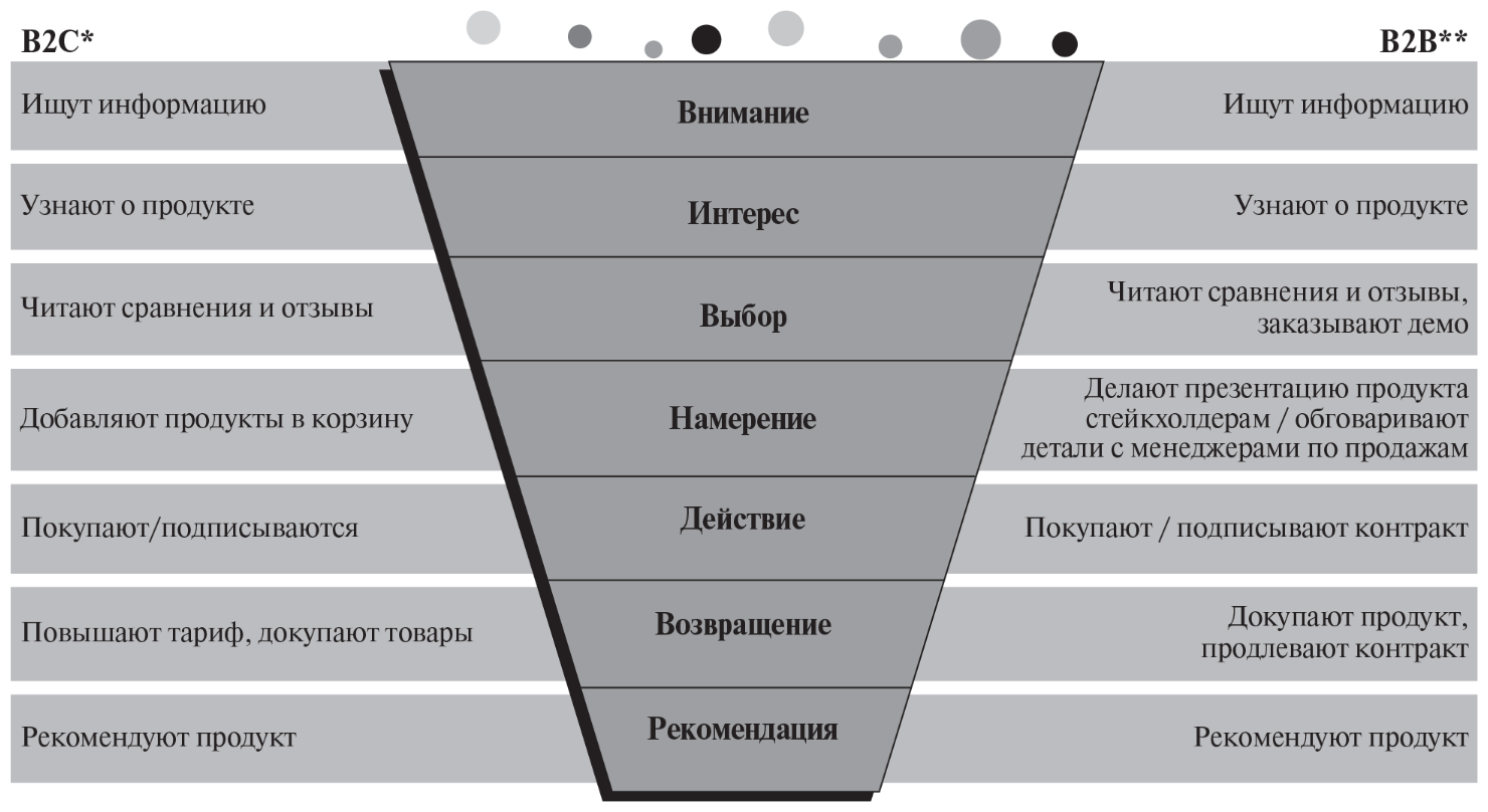 Этот процесс принятия решения клиентом также известен как воронка продаж, конвейер продаж, воронка клиентов (sales funnel, sales pipeline, customer funnel). Цель маркетинговой воронки – вести аудиторию по всему пути продаж, от самой первой встречи с вашим продуктом до стадии покупки и даже дальше.