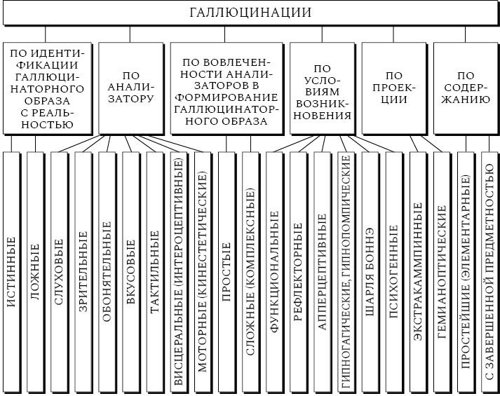 Классификация галлюцинаций по анализаторам: слуховые, зрительные, обонятельные, вкусовые, тактильные, висцеральные (интероцептивные), кинестетические (моторные, проприоцептивные) и их вариант – речедвигательные.