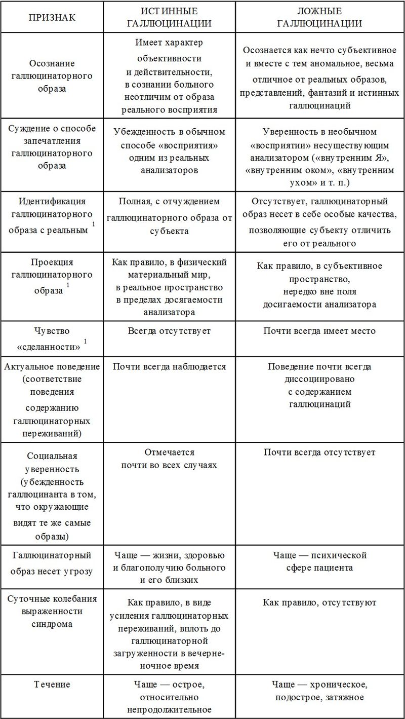 Наиболее существенным и клинически важным является разделение галлюцинаций на истинные и ложные (псевдогаллюцинации), критерии разграничения приведены в таблице II.1.1.