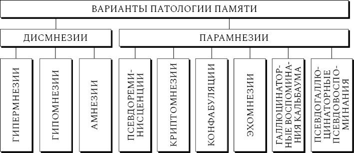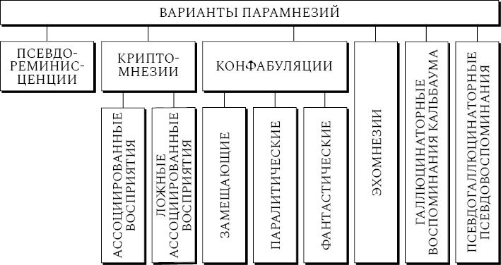 Парамнезии встречаются в форме псевдореминисценций, криптомнезий, эхомнезий, конфабуляций, галлюцинаторных воспоминаний Кальбаума, псевдогаллюцинаторных псевдовоспоминаний (рис. II.1.9).