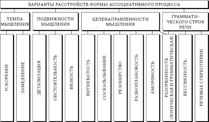 Расстройства формы ассоциативного процесса представлены нарушениями темпа, подвижности, целенаправленности мышления и грамматического строя речи (рис. II.1.17).