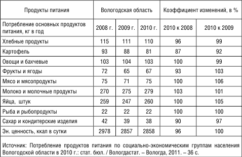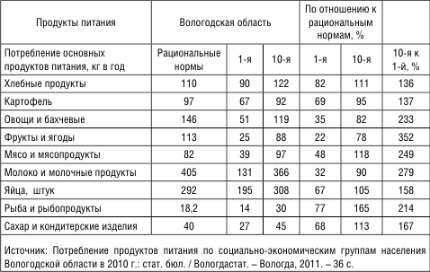 Различия в потреблении групп населения объясняется аномальной дифференциацией доходов. Если в 2008 г. наименее обеспеченные тратили на питание более половины потребительских расходов, то наиболее обеспеченные – лишь 19 %. Падение доходов, в особенности у наиболее богатых граждан, в 2009 г. несколько снизило различия в доходах населения. В 2010 г. наименее обеспеченные жители области тратили 42 % потребительских расходов на продукты питания против 57 % в 2008 г.; данные изменения могут быть объяснены повышением платежей за ЖКУ, натуральных поступлений, а также расширением на рынке области деятельности low-cost сетей типа «Магнит». Отрадно, что, согласно этим данным статистики, в 2010 г. всё население Вологодской области достигло «среднезажиточного уровня» в терминологии Коммунистической партии
