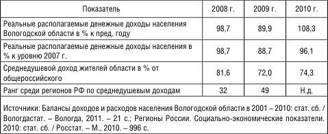 Основным фактором, определяющим потребление товаров и услуг в регионе, являются доходы населения. В 2010 г., после их падения годом раньше на 10 %, наблюдался восстановительный рост доходов населения на 8,3 % (табл. 4).