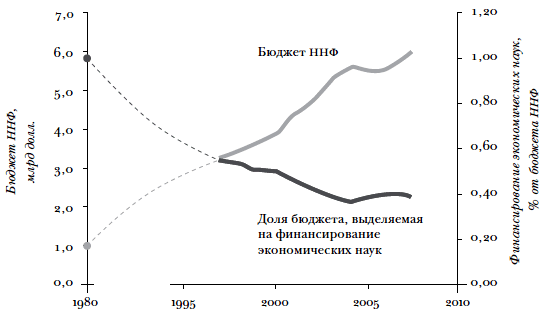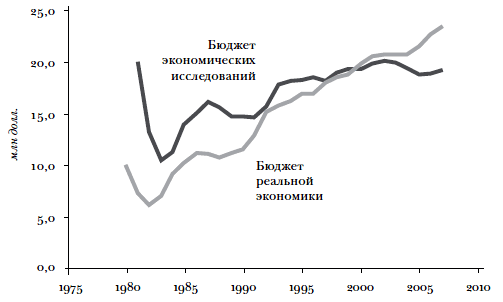 Данная глава написана с оборонительной позиции. То, что результаты фундаментальных исследований в экономике малоизвестны за пределами экономической сферы, представляется достаточно очевидным. Например, уровень финансирования фундаментальных исследований в экономике остается постыдно низким: финансирование исследовательской работы среднего доктора наук в экономике составляет лишь ничтожную долю аналогичного финансирования в других науках (см. табл. 0.1 и рис. 0.1). Средства, выделяемые Национальным научным фондом (ННФ) на экономику, не увеличиваются в течение десятилетий, несмотря на постоянный рост общего бюджета Фонда (см. рис. 0.2 и 0.3). Собственно, в реальном исчислении финансирование экономических исследований ННФ с начала 1990-х гг. застыло на одном уровне, хотя финансирование других наук стабильно и заметно возрастает. Можно задаться вопросом: не получают ли фундаментальные исследования в экономике финансирования из других источников, помимо ННФ? К сожалению, на экономику не распространяется действие хорошо финансируемых и имеющих большой штат программ, осуществляемых государственными учреждениями, в то время как многие из этих учреждений оказывают значительную поддержку другим наукам. Для большей наглядности отметим, что ежегодно другим наукам выделяют больше средств, чем экономика получала за всю историю человечества, и такой перекос финансирования существует на протяжении десятилетий.