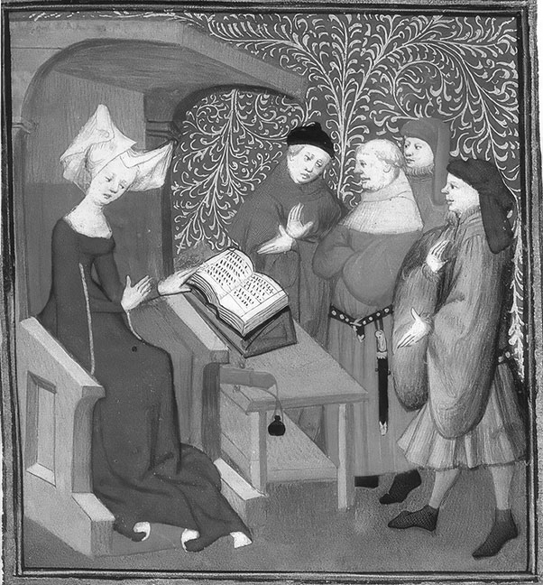 Неизвестный миниатюрист (Париж). Кристина Пизанская представляет свою книгу королеве Изабелле Баварской. Миниатюра из сборника ее произведений. Ок. 1410–1414 гг. Британская библиотека, Лондон