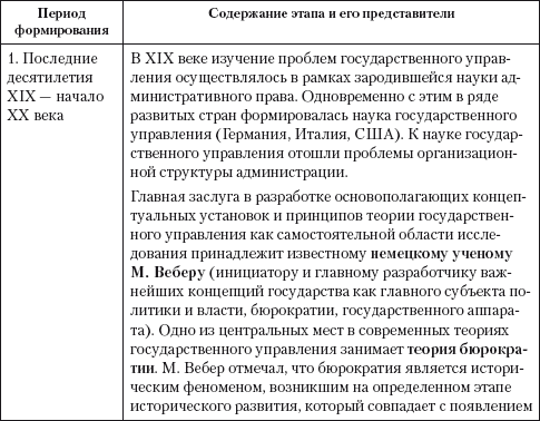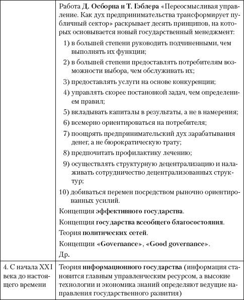 Достижения науки государственного управления, включающие многие подходы и концепции (структурно-системные, неоинституционалистские, кибернетические, менеджериальные, сетевые, синергетические, постмодернистские и др.), разрабатывались и исследуются сегодня учеными многих дисциплинарных направлений82. Истории развития управленческой мысли посвящено много научных работ. На основе анализа исследований по истории управления можно выделить четыре основных этапа формирования теоретико-методологических основ государственного управления: