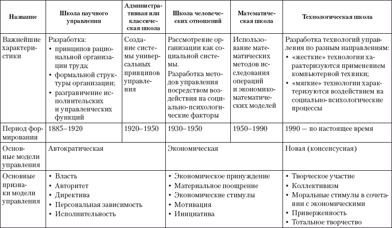 Это можно проследить, анализируя последовательность развития теорий государственного управления и основные характеристики научных школ менеджмента, представленные в табл. 2.