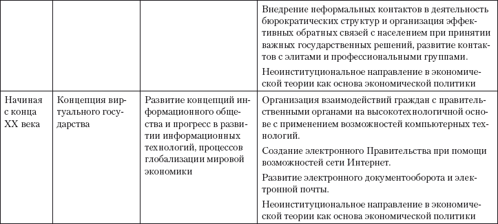 Долгое время наилучшим способом организации управления считалась модель «рациональной бюрократии» М. Вебера, который в начале ХХ века обосновал модель идеальной формы административной организации. По мнению ученого, бюрократическая организация в плане точности, постоянства, надежности превосходит другие формы построения управляющей системы. Однако в конце 70-х – начале 80-х годов ХХ века в зарубежных странах наблюдались активные реформы системы государственного администрирования (от стран Юго-Восточной Азии до Американского континента). Они различаются как по типу политической системы, так и по уровню развития. Эти преобразования продолжаются до сих пор и преследуют масштабные цели: правительства в ходе реформ заново определяют роль и задачи государства, его отношения с гражданами и общественными институтами. Их основой служат соответственно бюрократическая и менеджериальная парадигмы в управлении. Основные существовавшие концепции государственного управления и их содержание проанализированы в табл. 3.