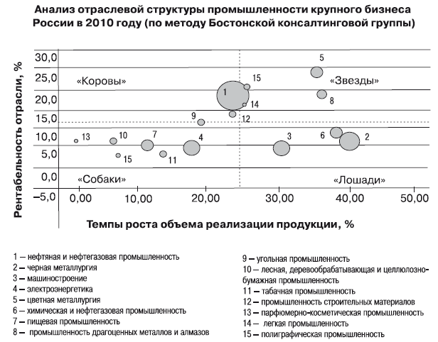Рис. 4. Анализ отраслевой структуры промышленности крупного бизнеса России в 2010 году по методу Бостонской консалтинговой группы (по данным рейтинга крупнейших предприятий России «Эксперт 400»95)