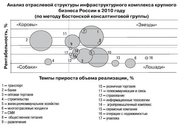 Рис. 5. Анализ отраслевой структуры инфраструктурного комплекса крупного бизнеса России в 2010 году по методу Бостонской консалтинговой группы (по данным рейтинга крупнейших предприятий России «Эксперт 400»96)