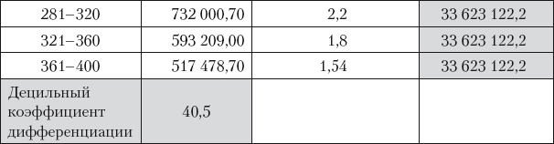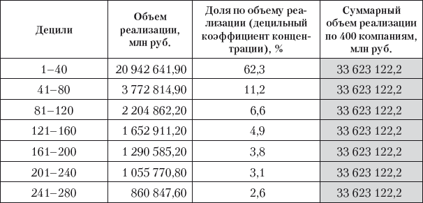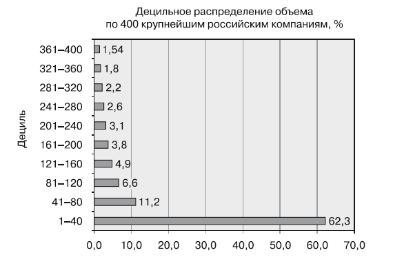 Показатели концентрации крупного бизнеса на основе расчета децильного распределения объема реализации продукции по 400 крупнейшим российским компаниям, а также децильного коэффициента дифференциации в 2010 году приведены в табл. 5 и 6 и на рис. 6.