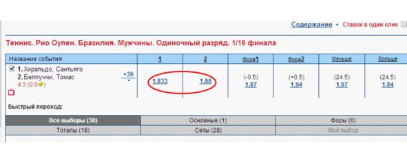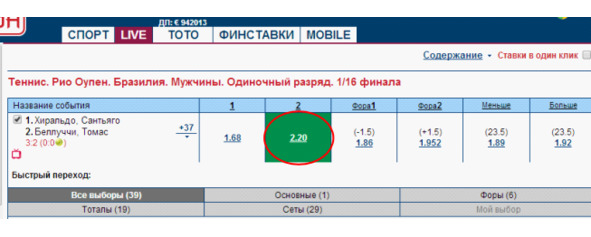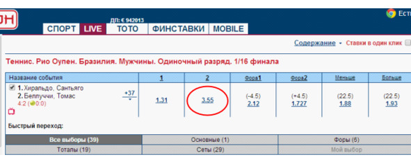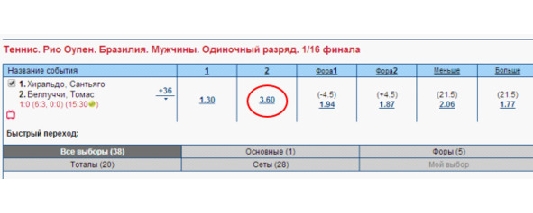 Если вы ставите на победу Белуччи под кф 3,55 при счете 4:2, то у вас существует возможность выставиться в обратку на Хиральдо в случае обратного брейка, а если это не получится, то, по крайней мере, в запасе у вас целый второй сет с отличными шансами у Белуччи на успех, выиграв который или сделав брейк в средней части второго сета, он опять же поставит вас выигрышную позицию.