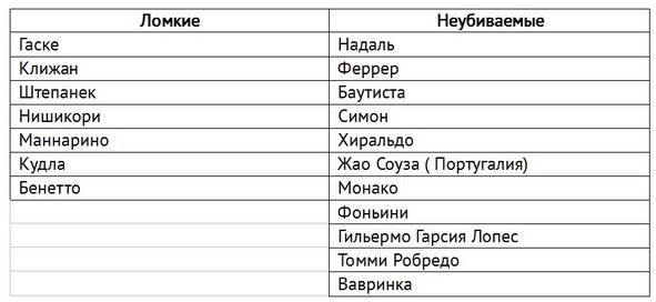 Примерно аналогичные закономерности вы можете наблюдать и у остальных ломких теннисистов. Схемы одни и те же, только лица другие. Будьте только осторожны с ломкими ребятами на индурах и на турнирах без жары, а также когда они получают дни отдыха на турнирах трехсетового формата, где они могут выдержать даже 2 сложных матча подряд. Но общие закономерности, думаем, все уловили.