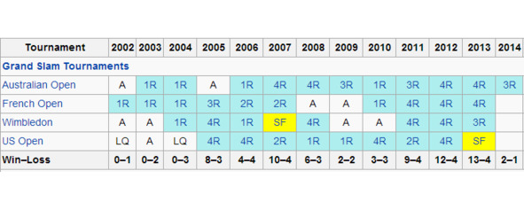Сейчас мы подробно разберем его статистику, и вы увидите, о каких закономерностях мы говорим. Они довольно прозрачны. Для начала давайте проанализируем его статистику на турнирах Большого шлема. Там много интересного.