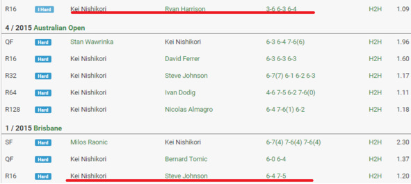 Начало сезона. Первый турнир в Брисбене. Плюсовая фора на Джонсона сыграла. Ниcикори поначалу был очень далек от даже средней игры. Далее после АО 3 недели отдыха и перелет в Штаты. Для Нисикори все, что больше двух недель без игровой практики – это потеря в качестве игры на начальных стадиях турниров. Как итог, проигрыш первого сета «мертвому» Харрисону. Далее японец немного разыгрался и уверенно дожал американца. И плюсовая фора на Харрисона на первый сыграла, как, впрочем, и сама плюсовая фора. Едем дальше.