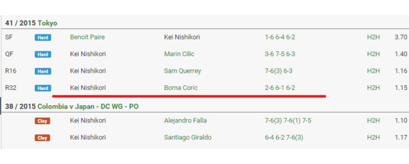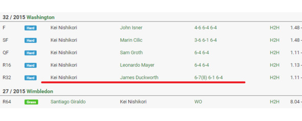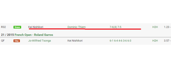 Как с этой особенностью можно и нужно добирать? Плюсовая фора на первый сет на оппонента Ниcикори выглядит очень вкусно в описанных выше ситуациях. Пожалуй, вкуснее всего. Хотя и обычная плюсовая фора тоже сойдет. Чтобы не быть голословными, приведем опять ряд принтов.