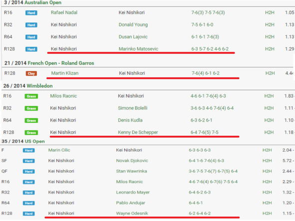 Свод результатов на ТБШ за 2014 год. Красным выделены результаты по первым раундам. Непонятные 5 сетов с Матошевичем в Австралии, проигрыш Клижану на РГ, очень равная игра с Дешепером на Уимблдоне и легкая победа над Одесником на Us Open. Везде, кроме Штатов, у Нисикори были проблемы по первым раундам. Далее японец показывает гораздо более содержательный теннис, но вначале он зачастую барахлит.