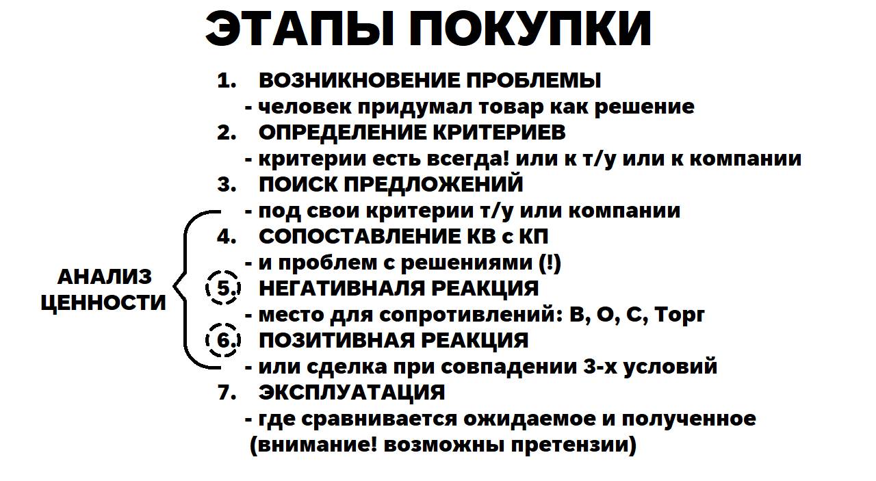 Этапы покупки (не путайте с этапами продажи) – шаги, которые проходит человек, приобретая абсолютно любой товар от бутылочки воды в супермаркете до покупки биржевых акций. Большинство сопротивлений возникает потому, что продавец или не знает об этих шагах, или осознанно игнорирует их: